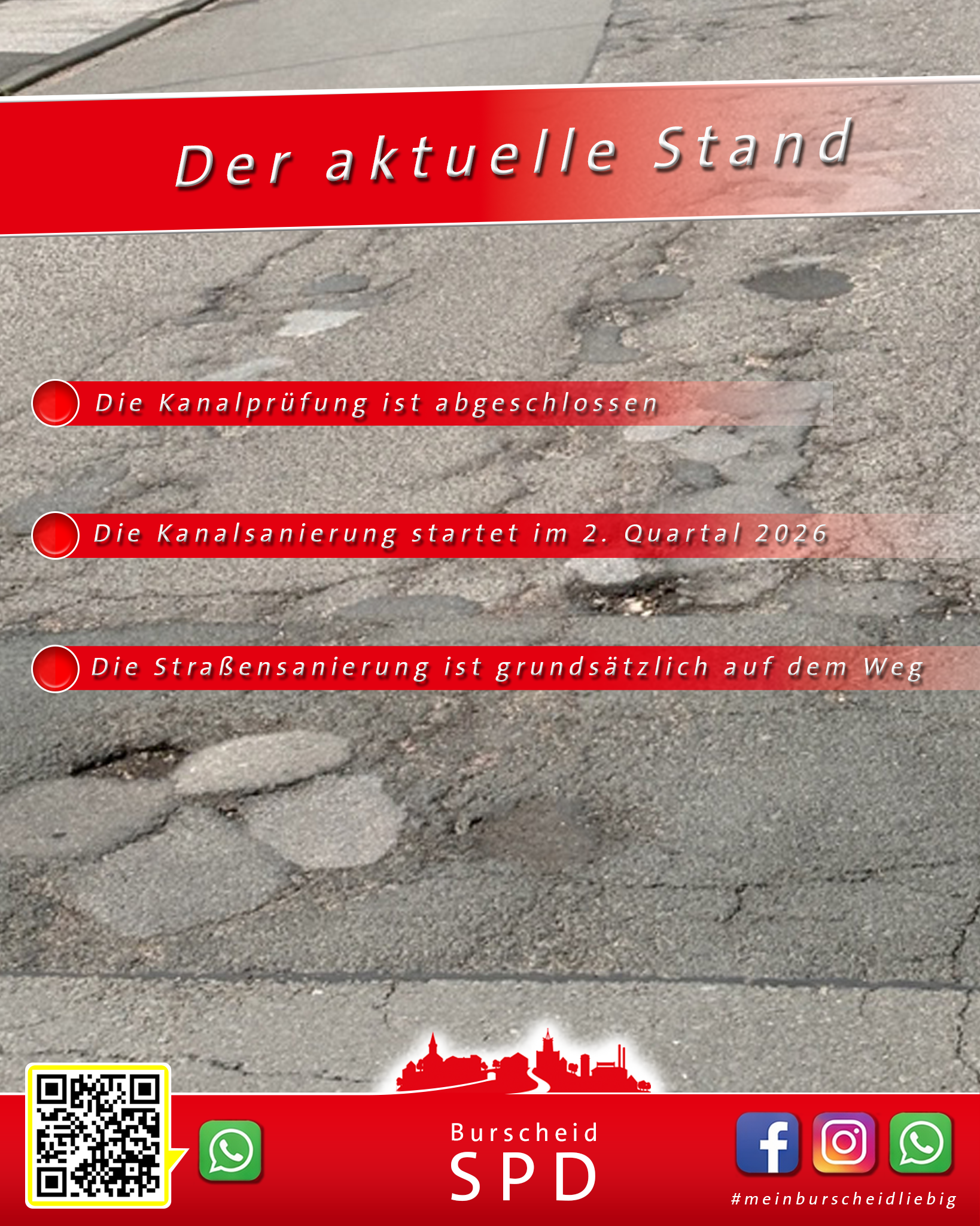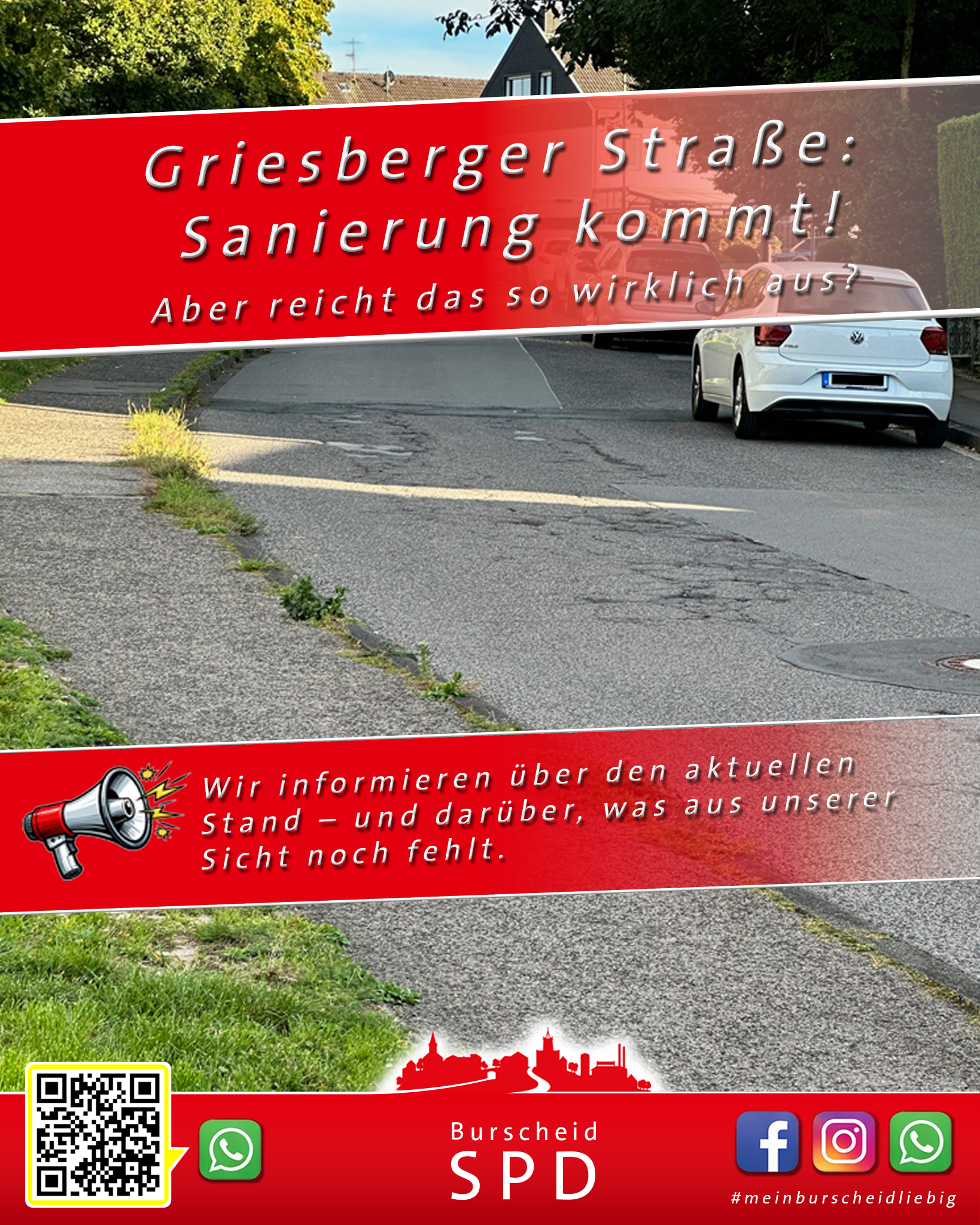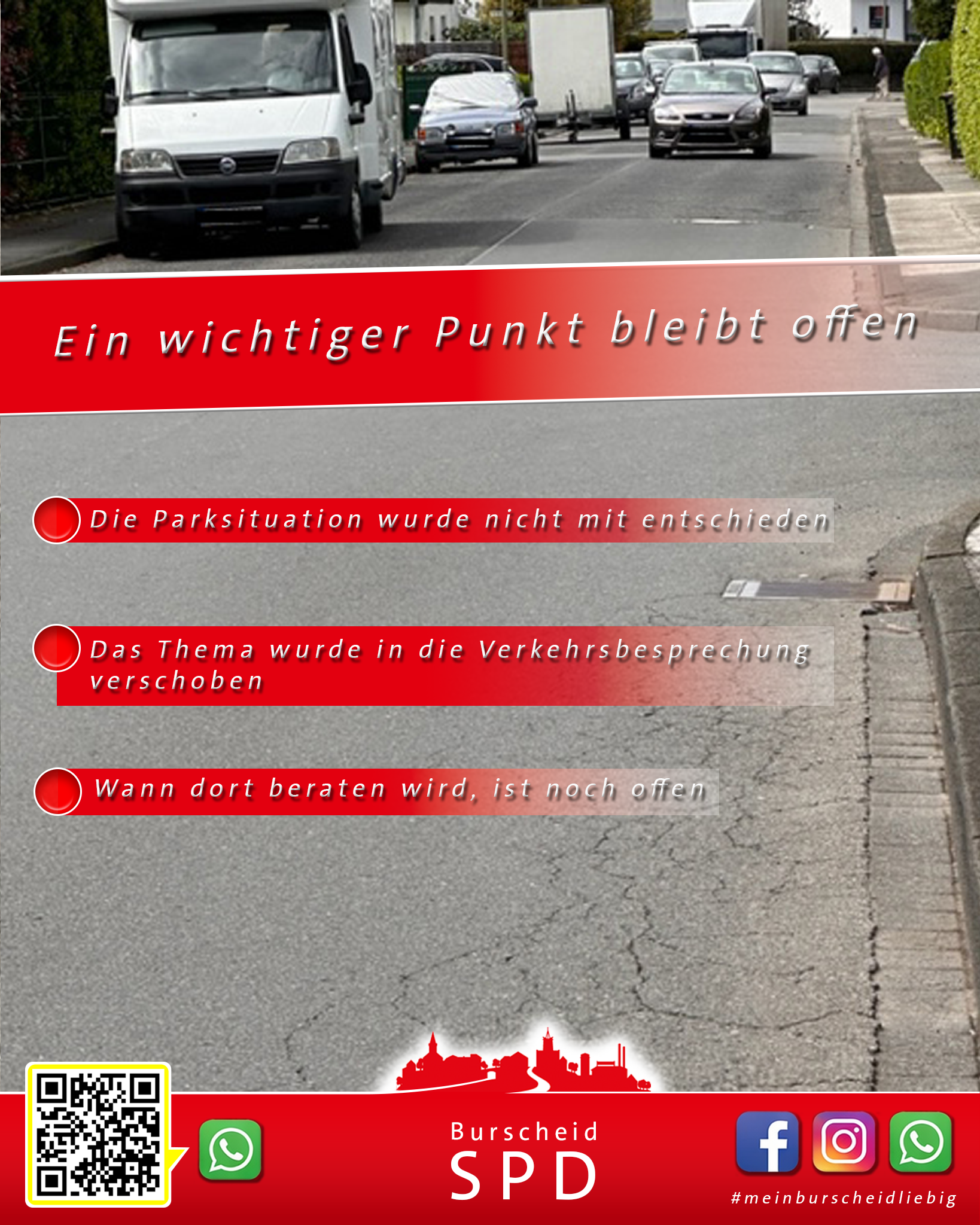 Auch wenn dieser Punkt nun zunächst verschoben wurde, bleibt er aus unserer Sicht wichtig. Wir werden die weitere Entwicklung aufmerksam begleiten und uns weiterhin dafür einsetzen, dass mit der Sanierung nicht nur die Fahrbahn erneuert, sondern auch die Alltagssituation vor Ort verbessert wird.