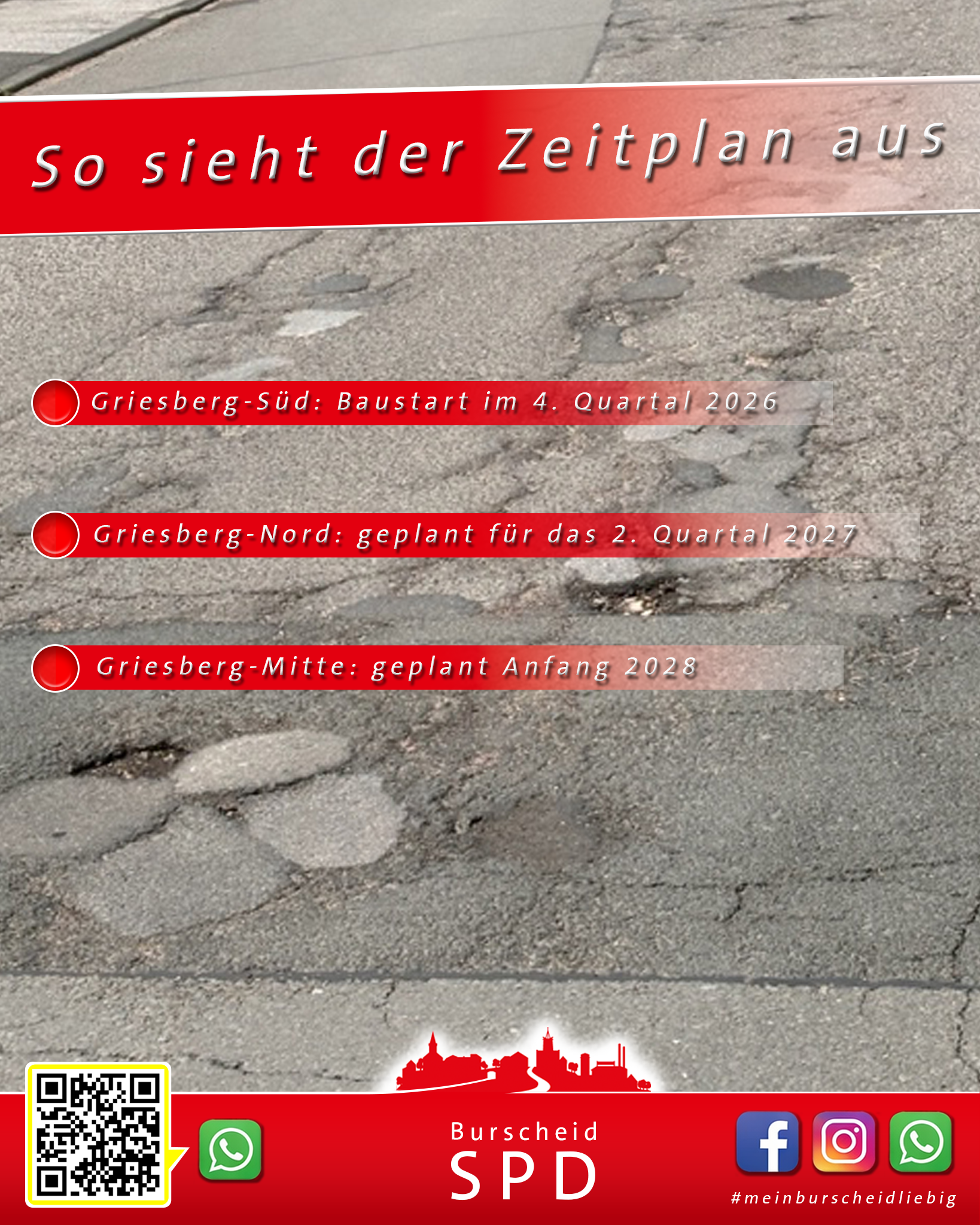 Dabei wurde deutlich: Die Kanalprüfung im Bereich Griesberg ist abgeschlossen. Damit sind die technischen Voraussetzungen für die weitere Sanierung geschaffen. Nach Angaben der Verwaltung soll die Kanalsanierung im 2. Quartal 2026 beginnen. Die anschließende Straßensanierung ist abschnittsweise vorgesehen: Griesberg-Süd ab dem 4. Quartal 2026, Griesberg-Nord ab dem 2. Quartal 2027 und Griesberg-Mitte Anfang 2028.